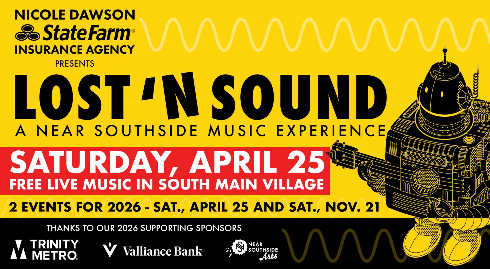 With eyes on 2026, we're planning for two big events for the second season of Lost 'N Sound. South Main Village businesses are asked to begin making plans for Saturday, April 25 and Saturday, November 21. Musicians, please stay tuned for an opportunity to either update your existing musician profile or create a new one for the season ahead. Sponsors, we're excited to talk with you about opportunities to support the 2026 season of Lost 'N Sound. From season-long presenting sponsors to stage sponsors, we're eager to talk to you about partnership. Contact megan@nearsouthsidefw.org to discuss.