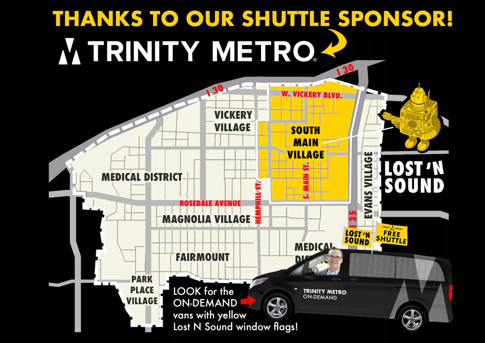 While you're enjoying your journey through South Main Village, don't miss the opportunity to travel between venues on the Lost 'N Sound Shuttle, provided by Trinity Metro! Look for circulating Trinity Metro ON-DEMAND vehicles branded with Lost 'N Sound yellow flags for a ride. Signs along South Main Street that indicate a shuttle stop to enjoy a FREE ride to your next venue between 3:00 pm and 10:00 pm.